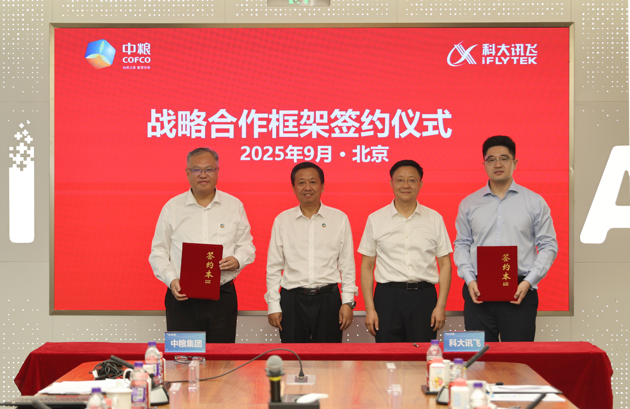 9月4日,中粮集团有限公司(以下简称“中粮集团”)与科大讯飞股份有限公司(以下简称“科大讯飞”)在北京签署战略合作协议,中粮集团党组书记、董事长李国强,科大讯飞董事长刘庆峰见证签约。