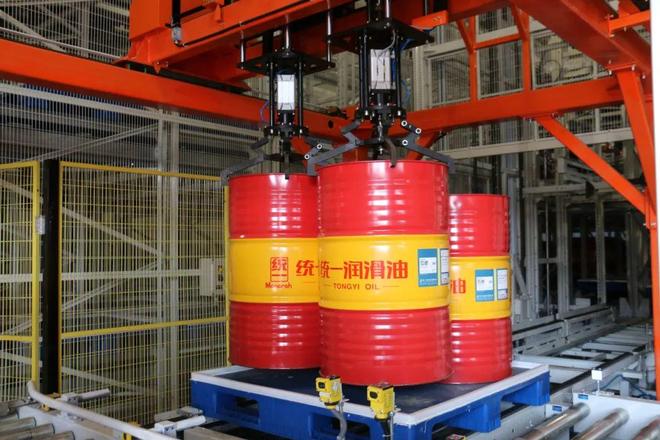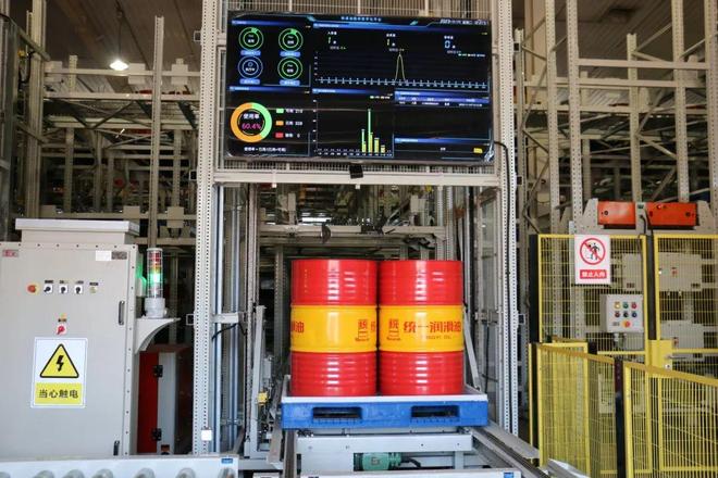 智能油脂库配备2台四向穿梭车、1套智能机械手,四向穿梭车立库共3层,543个存储货位,可储存2172桶油脂。